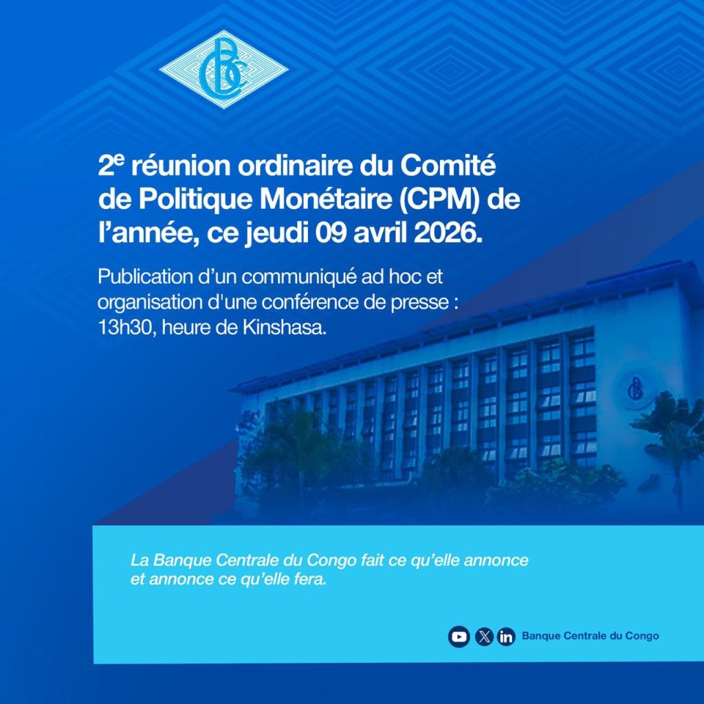 La Banque Centrale du Congo (BCC) tient, ce jeudi 9 avril 2026, la deuxième réunion ordinaire de son Comité de Politique Monétaire (CPM). Les conclusions, attendues avec une pointe d’impatience par les opérateurs économiques, seront dévoilées lors d’une conférence de presse prévue à 13h30.